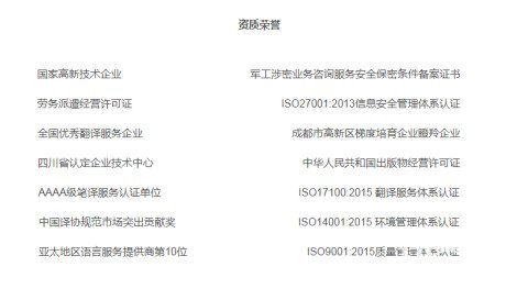 這里的“資質”指的是公司本身的資質,即該翻譯公司是否依法成立、合法經營,與其他公司一樣,營業執照、企業公章、對公賬戶、正規發票都是不可或缺的;另外,相關的榮譽證書也是判斷翻譯公司優劣的重要憑證,比如中國翻譯協會會員單位、美國翻譯協會會員單位、誠信經營示范單位等。